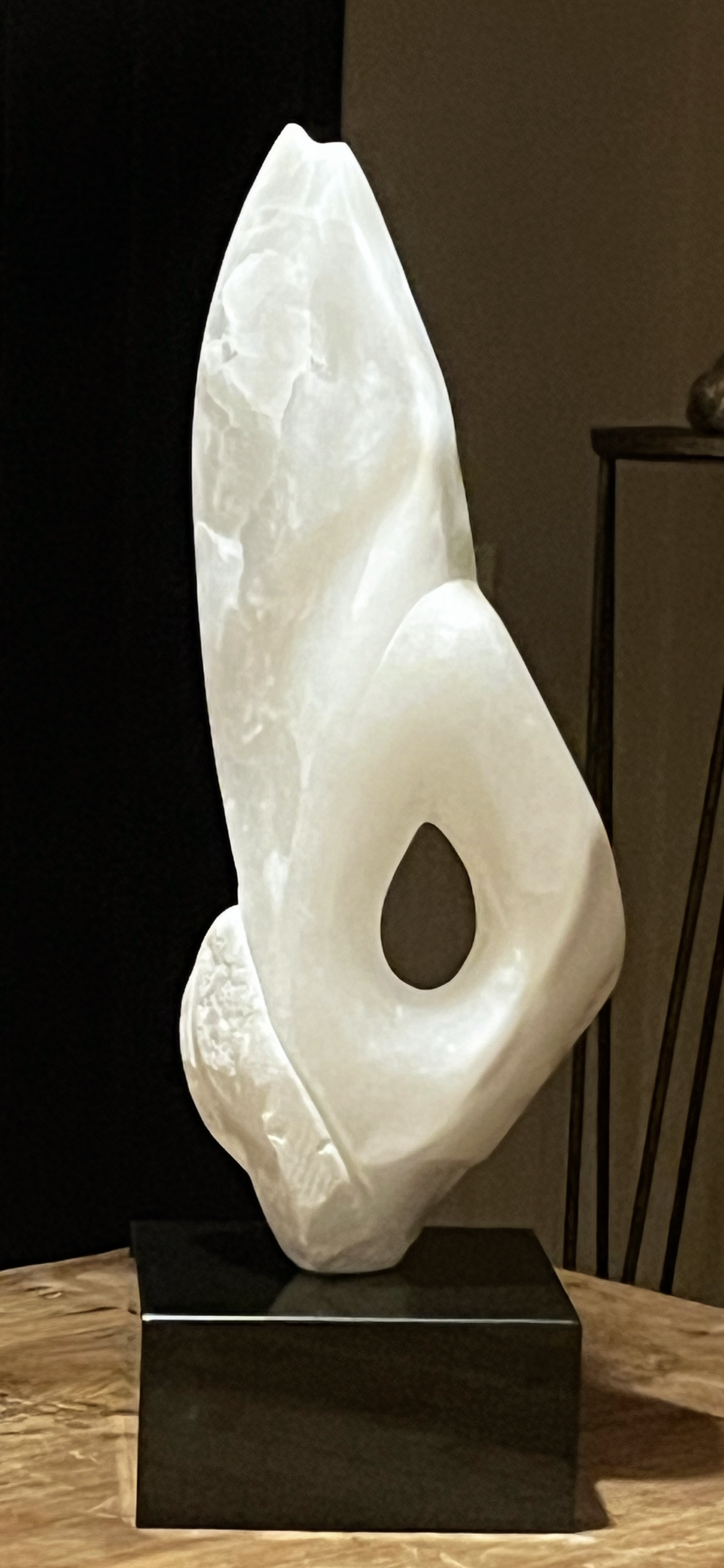 This heavy piece of 13kg called “Whispers” reflects the longing tenderness and ethereal connection that transcends physical distance. The ethereal quality of "Whispers" invites viewers to immerse themselves in the intangible realm of emotions, where distance is but a mere illusion. This alabaster sculpture stands fearless as a tribute to the enduring love of a mother for her son, resonating with anyone who understands the profound depths of a connection that remains unbroken despite the vastness of the world that separates them